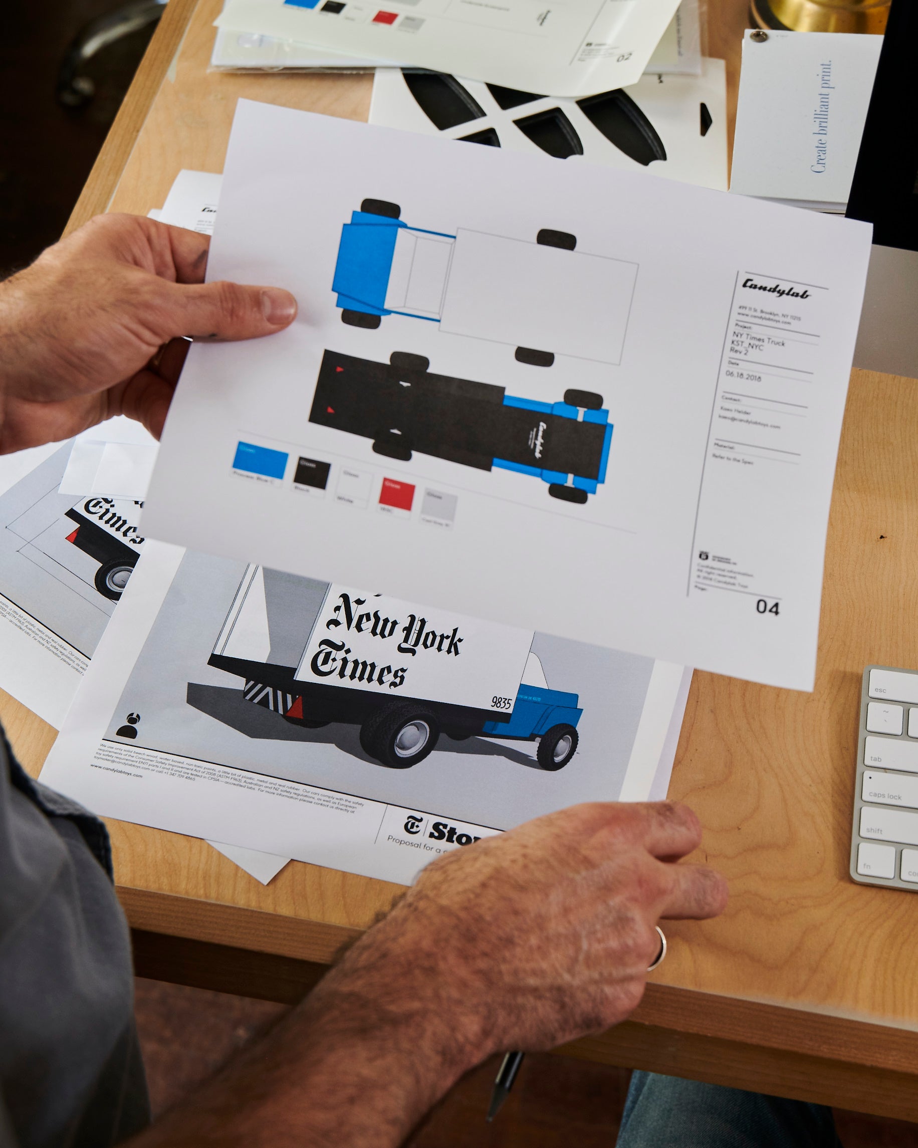 When the New York Times Store decided to add an actual wooden toy car for their Holiday season selection, they called upon us to make a newspaper delivery truck toy, branded with their famous logo. Searching the archives with the NYT team, deciding what makes the soul of the humble delivery truck, and engineering a new wooden toy from scratch on a tight schedule was exhilarating.
