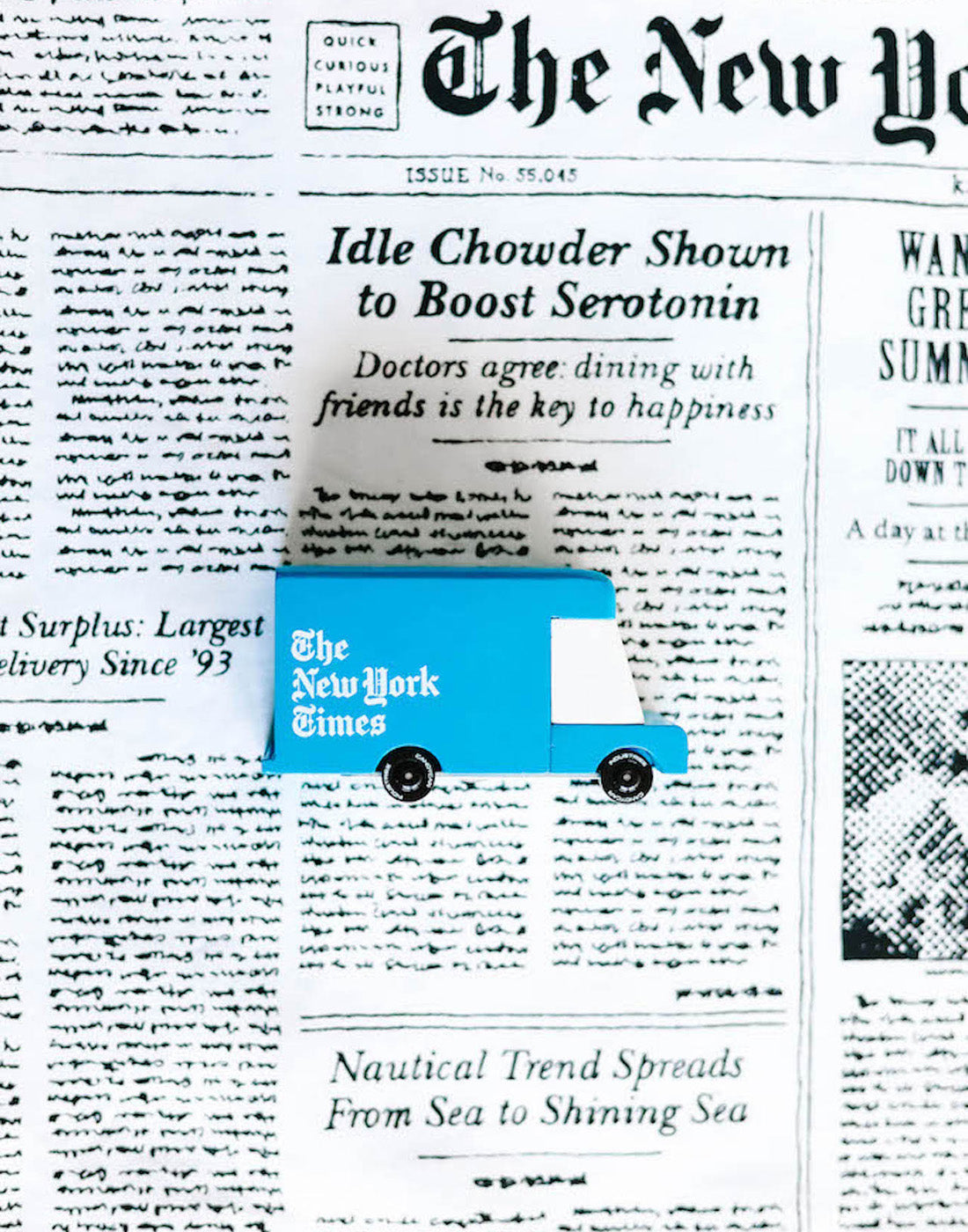 Breaking news: A new Times truck is rumbling into Toy Town. Just the right size for young readers and grown-up collectors, the cute 3.5” van was inspired by The New York Times blue-and-white delivery vehicles that plied the tri-state roads more than 35 years ago. Made of solid wood, and limited quantities available.
