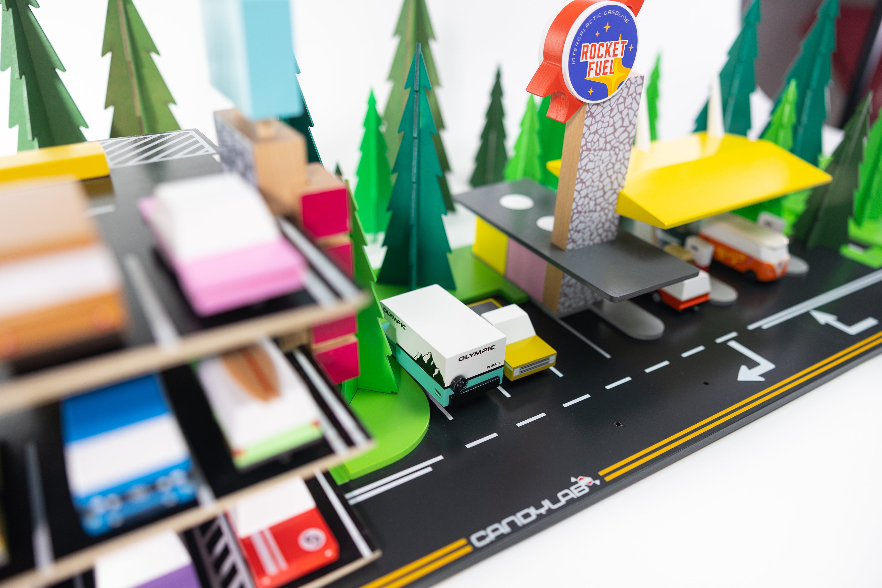 The CANDYCAR® PlayScape Board is the perfect backdrop for the Rocket Fuel Station and our newly released Trees. It has a slot for connecting it to the Magnetic Parking Garage*.