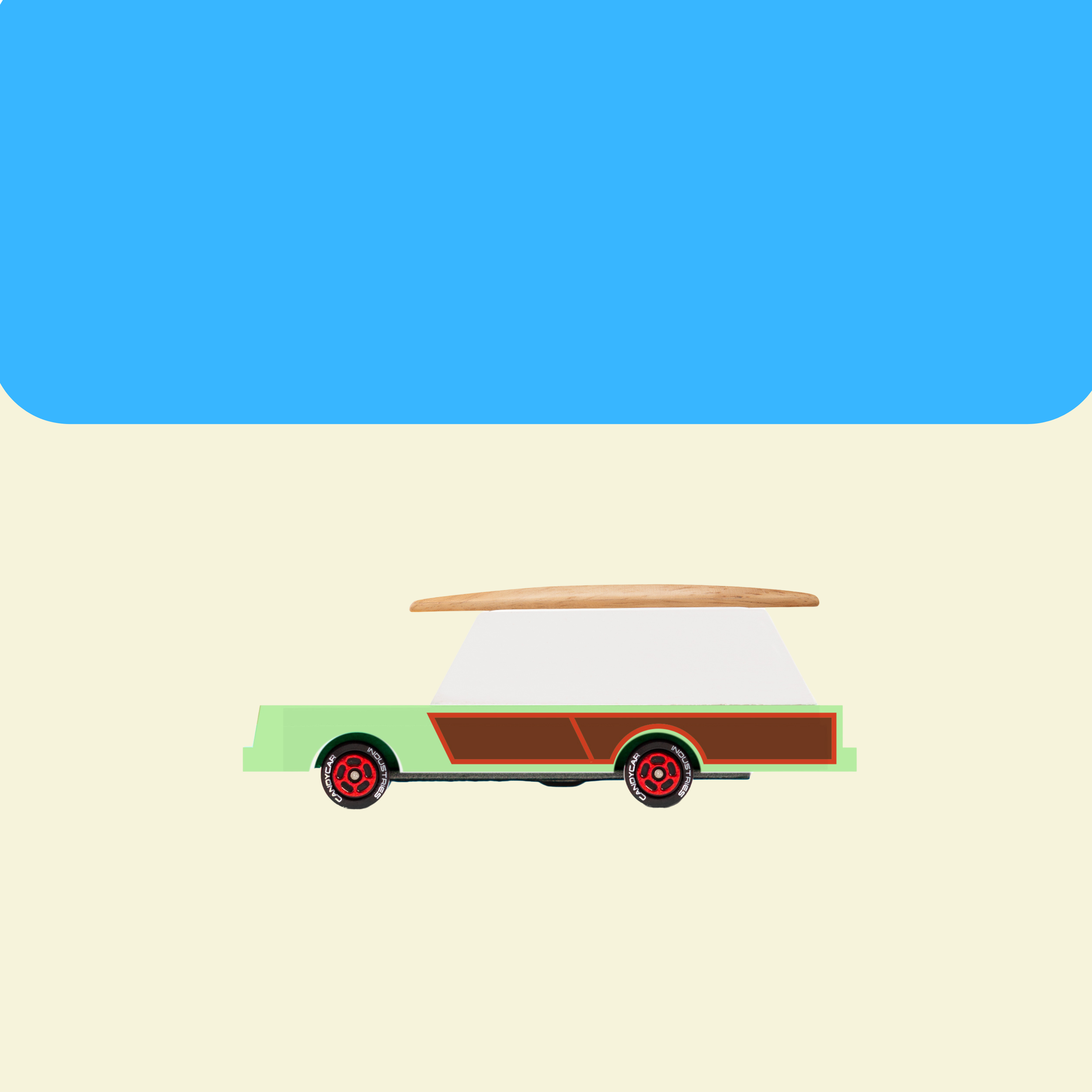 Swell times are guaranteed with the Surf Wagon. An attached wooden surf board and tow hitch for our CANDYCAR® Campers make for a radical combo.