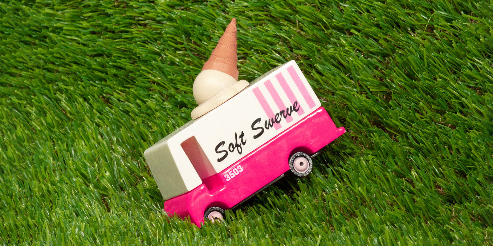 Soft-serving up good looks. As far as a symbol of simpler times and a carefree way to stuff sugar and calories in your childhood, you can’t beat the ice cream truck. We popped a melty top, added a bright pink base, sprinkled a pun, and voila! Iconic toy made. No ice cream truck jingle – you’re welcome.