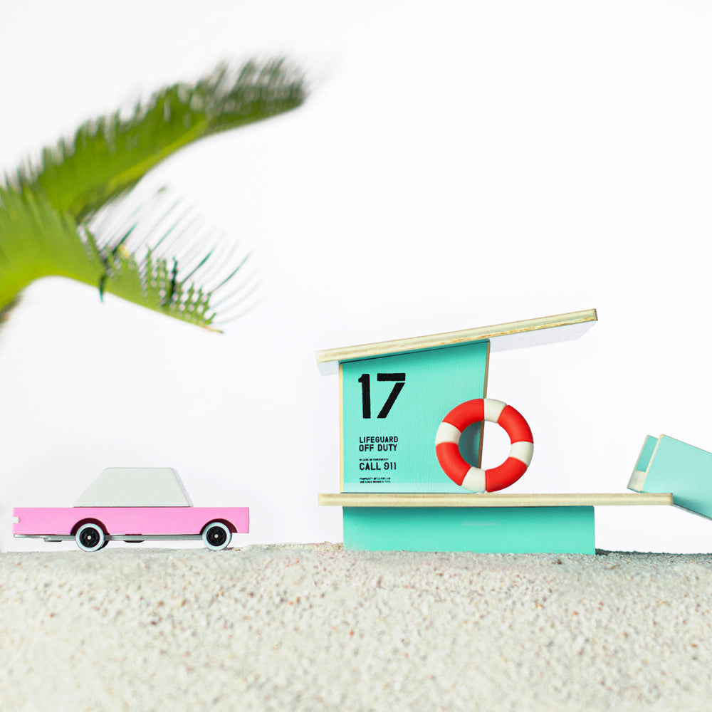 Teal Santa Monica + B.Berry| Time to hit the waves with the Teal Beach Tower Combo! Our first ever CANDYCAR® scaled lifeguard tower is the perfect accessory for all beach-themed play. Make it a combo and get a discounted Pink Sedan CANDYCAR® so you can get to playing right away. Pastel-painted wooden parts that assemble in seconds using our simple peg-and-hole system!
