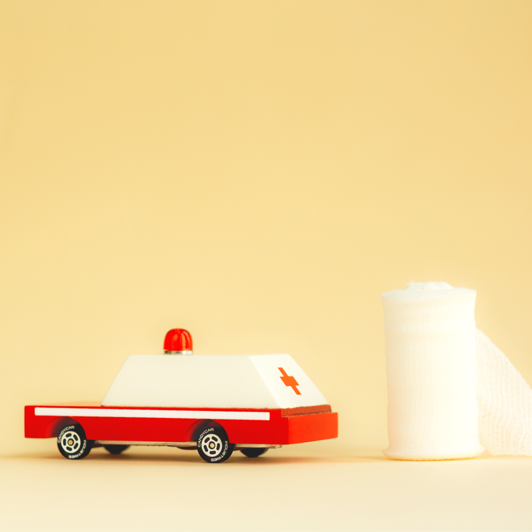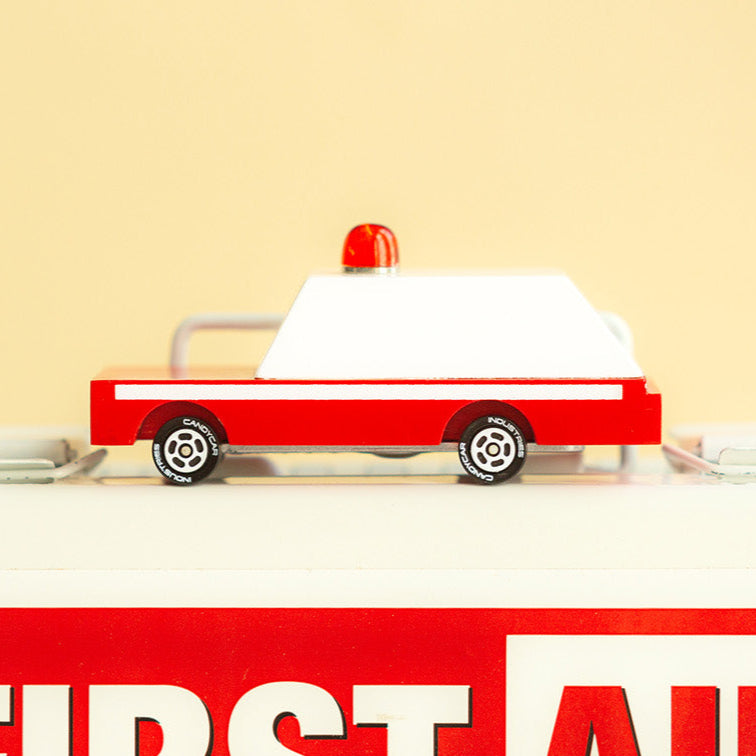 We’ve got a mini medic here to lend a helping hand! This Red and White Candycar Ambulance is first on the scene.
